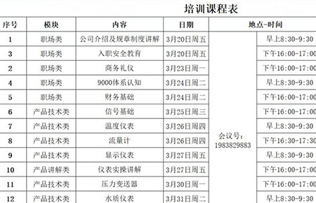 此次培訓會主要圍繞公司規章制度、入職安全、商務禮儀等職場類知識以及水質、溫度、壓力等儀表基礎知識兩方面展開,并邀請了公司里十余位經驗豐富的資深講師。