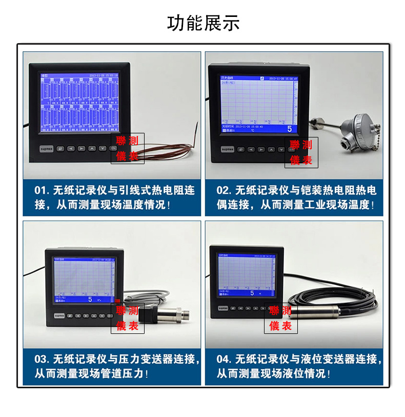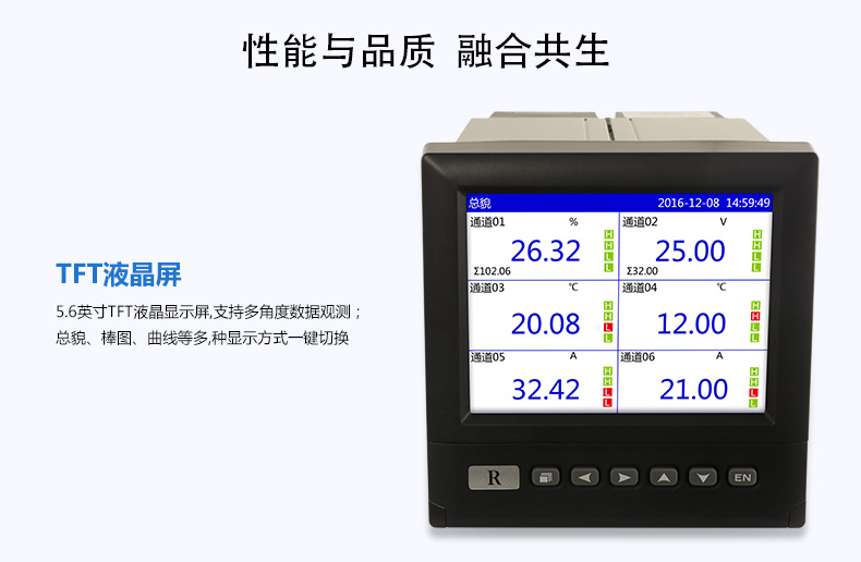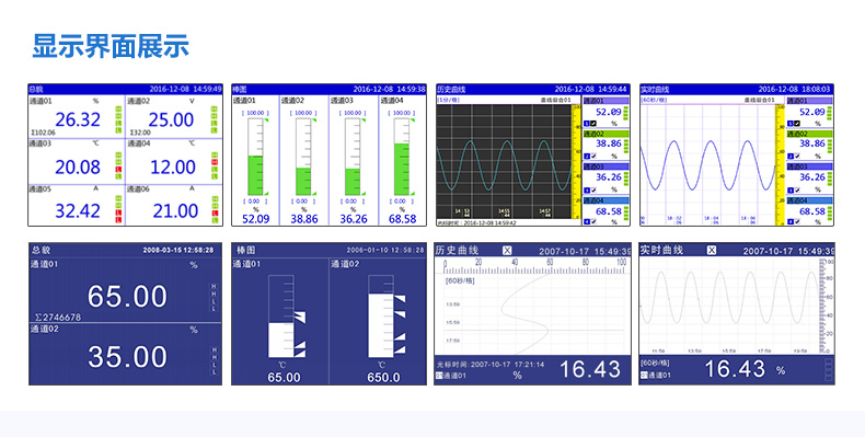 無紙記錄儀是將采集的數據/運算數據以時間為基軸記錄在儀器內部的存儲系統中,無消耗任何常用的記錄設施,如:紙張、筆墨。記錄在儀器內部的存儲數據,通過運算、模擬后顯示在液晶屏。常用顯示用液晶屏比較廣泛。在液晶屏屏幕上,可以顯示數字顯示、棒圖顯示、曲線顯示、報警列表等。無紙記錄儀采集的數據,常用的有:溫度、壓力、流量、液位、電壓、電流、濕度、頻率、振動、轉速等。